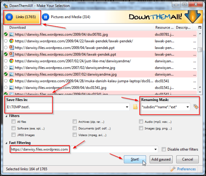 4) At DownThemAll! – Make Your Selection screen, do the following: