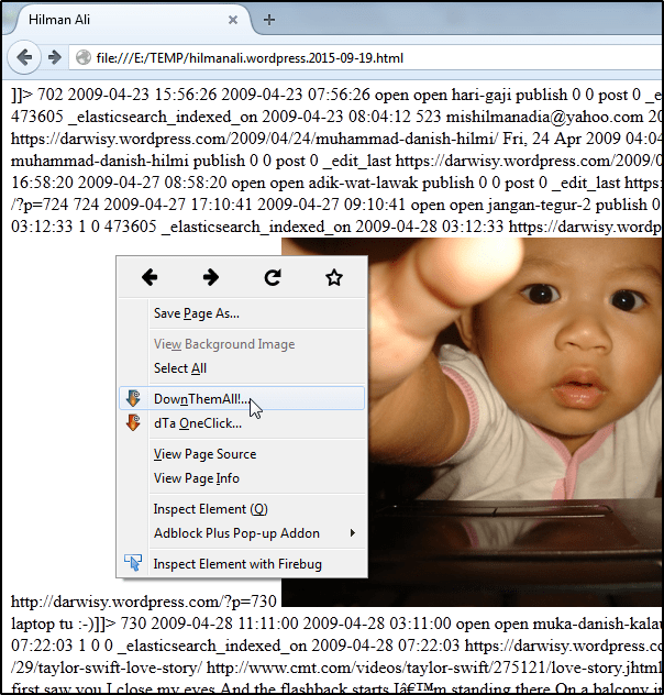 3) Open the renamed HTML file with Mozilla Firefox (Don’t panic with the content :-)), right click inside the opened file and choose DownThemAll! from menu