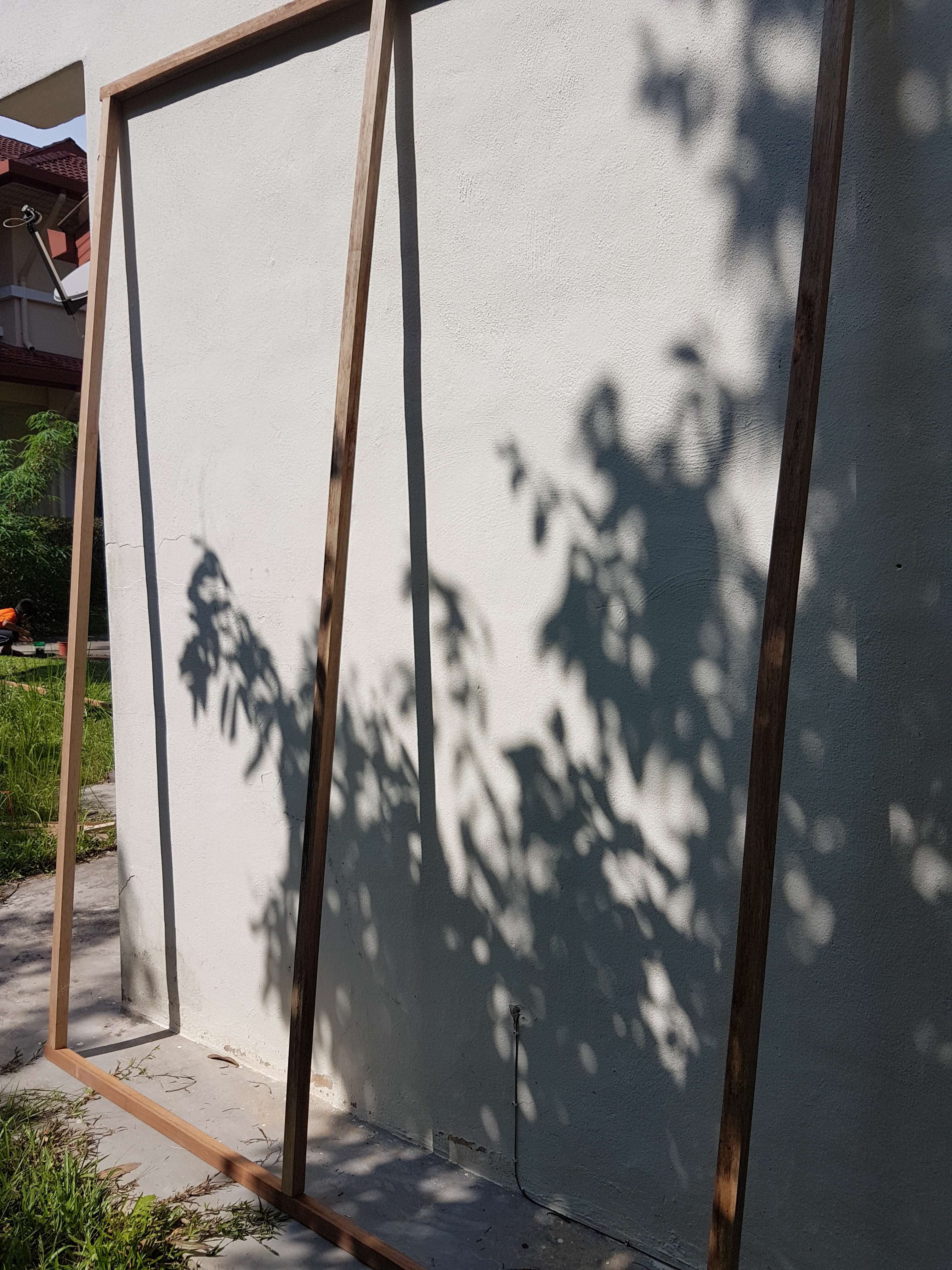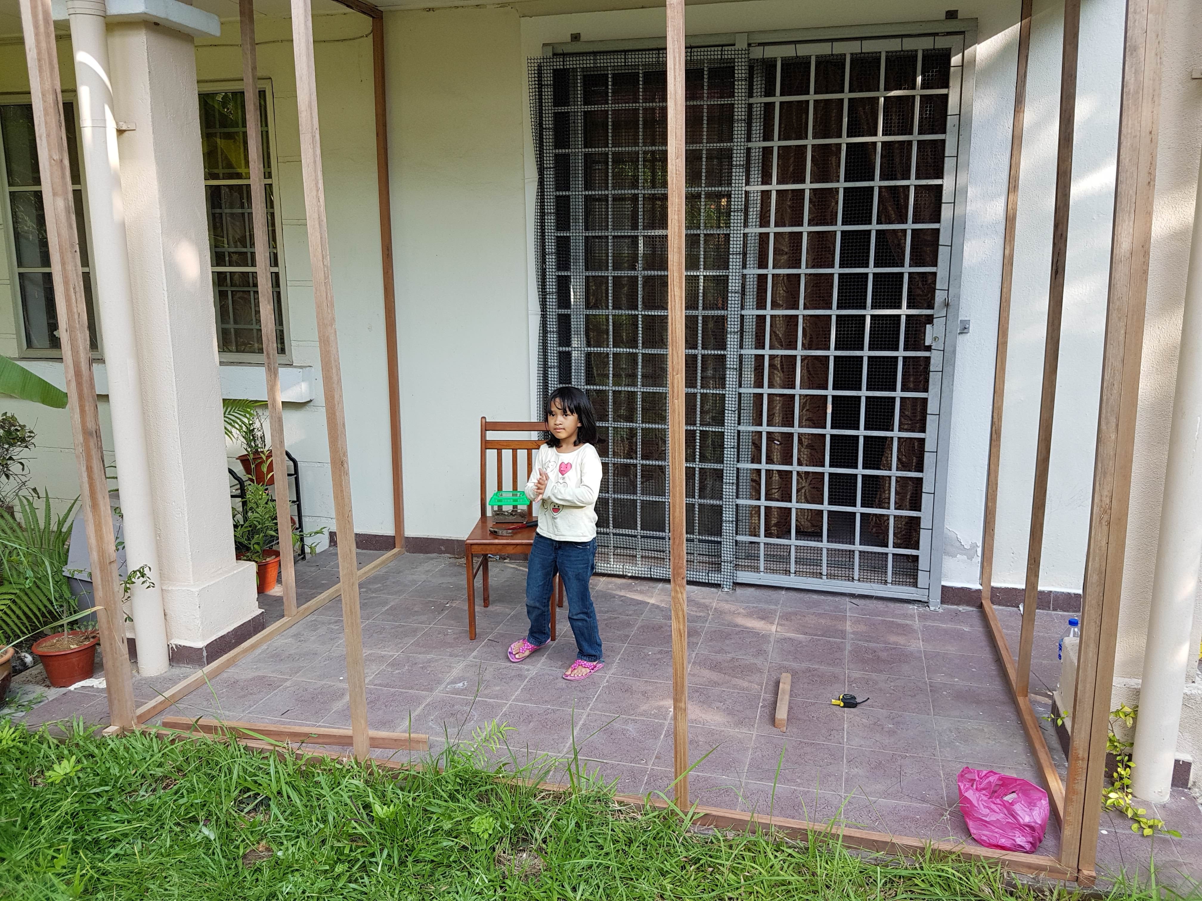 Sepatutnya, jaring tu dipasang sebelum semua bingkai naik. Tapi kebetulan pulak isi stapler-gun dah habis… kena lah postpone sebab takut tak sempat dah nak masuk Maghrib (penat pon ye jugak huhuhu). So, bayangkan je lah bingkai ni siap dipasang dengan jaring sekali 😀