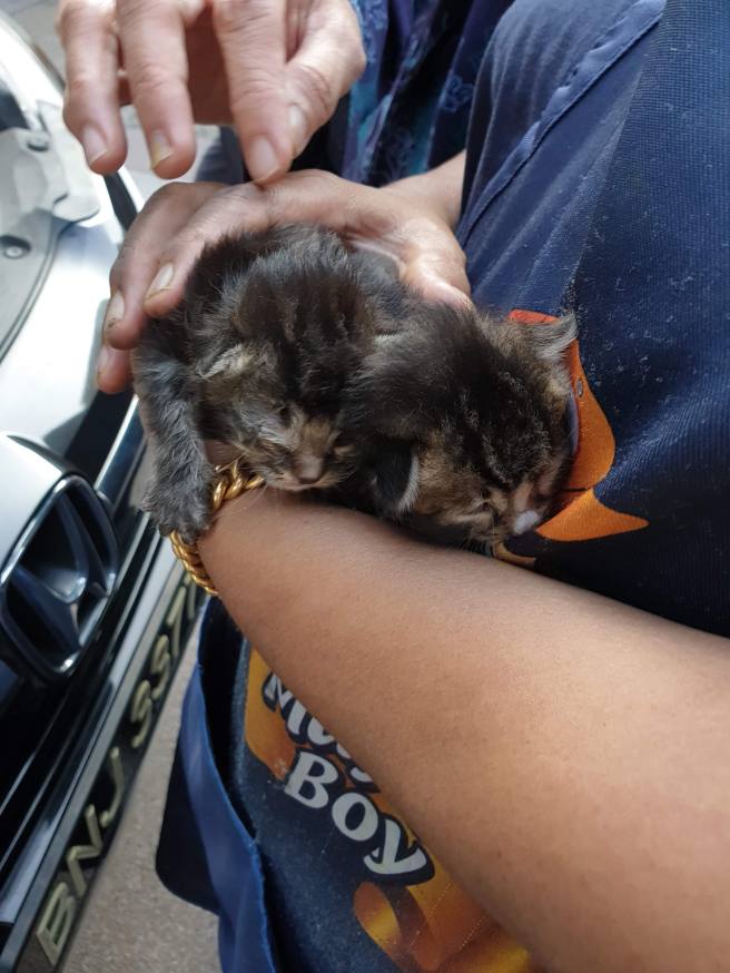 Terima mesej dari Mama, dia dengan kawan-kawan dah selamatkan 2 ekor anak kucing yang terperangkap dekat bahagian enjin kereta.