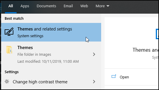 - Open the “Desktop Icon Settings” or click Start > search “Themes” > Desktop icon settings (in Related Settings).