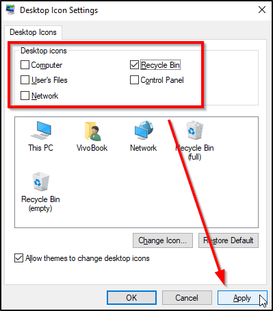 - Recheck any of “Desktop icons”, then click the Apply button.
